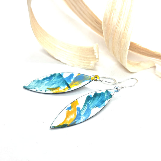 Abstract Colour enamel marquise drop earrings - jade green, light blue & yellow