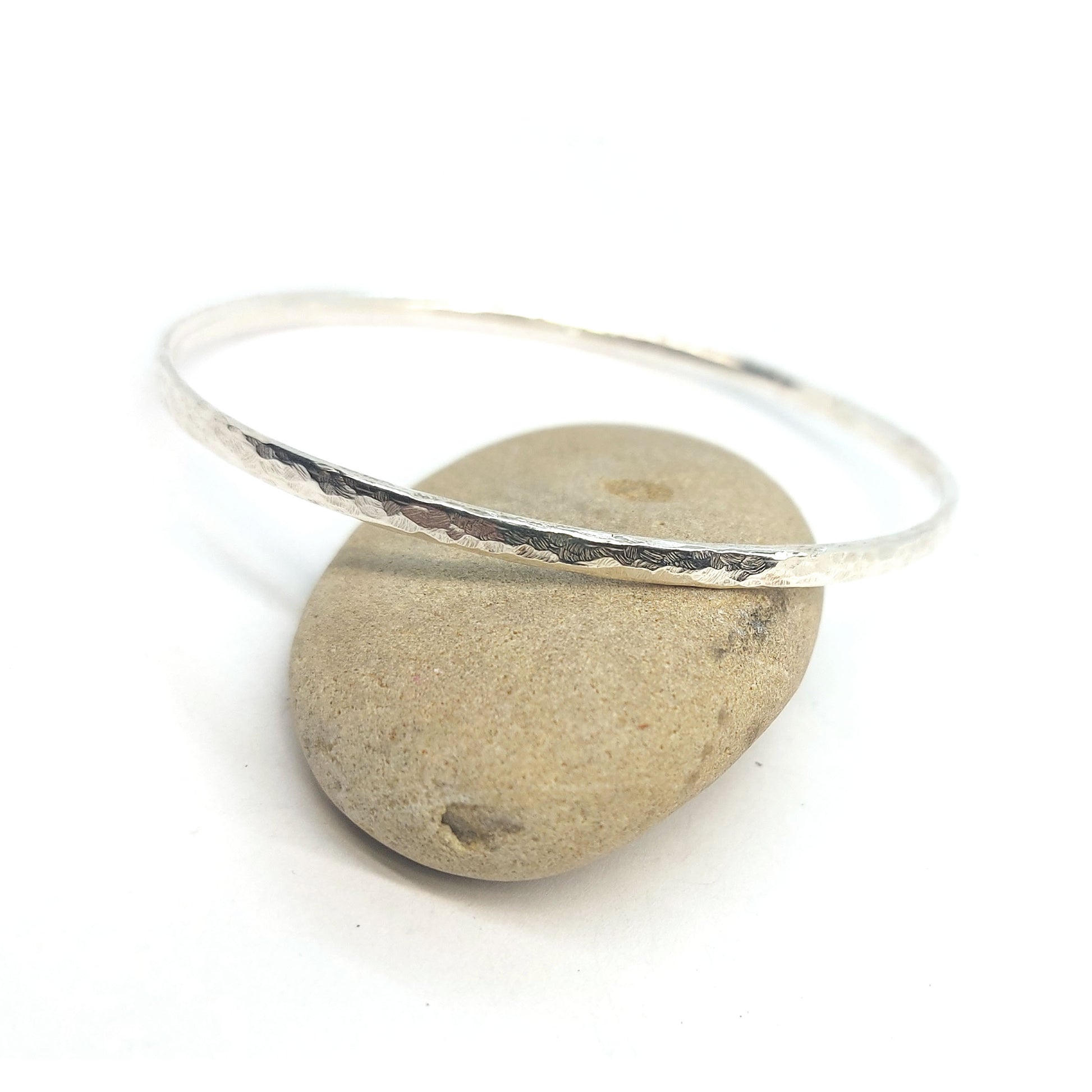 The handcrafted sterling silver Hammered Bangle – a timeless accessory designed to add an exquisite touch to your personal style. This elegant bangle is meticulously created in recycled sterling silver and is hallmarked to guarantee its quality and authenticity. With its captivating hammered texture, it effortlessly captures the essence of artisan craftsmanship.