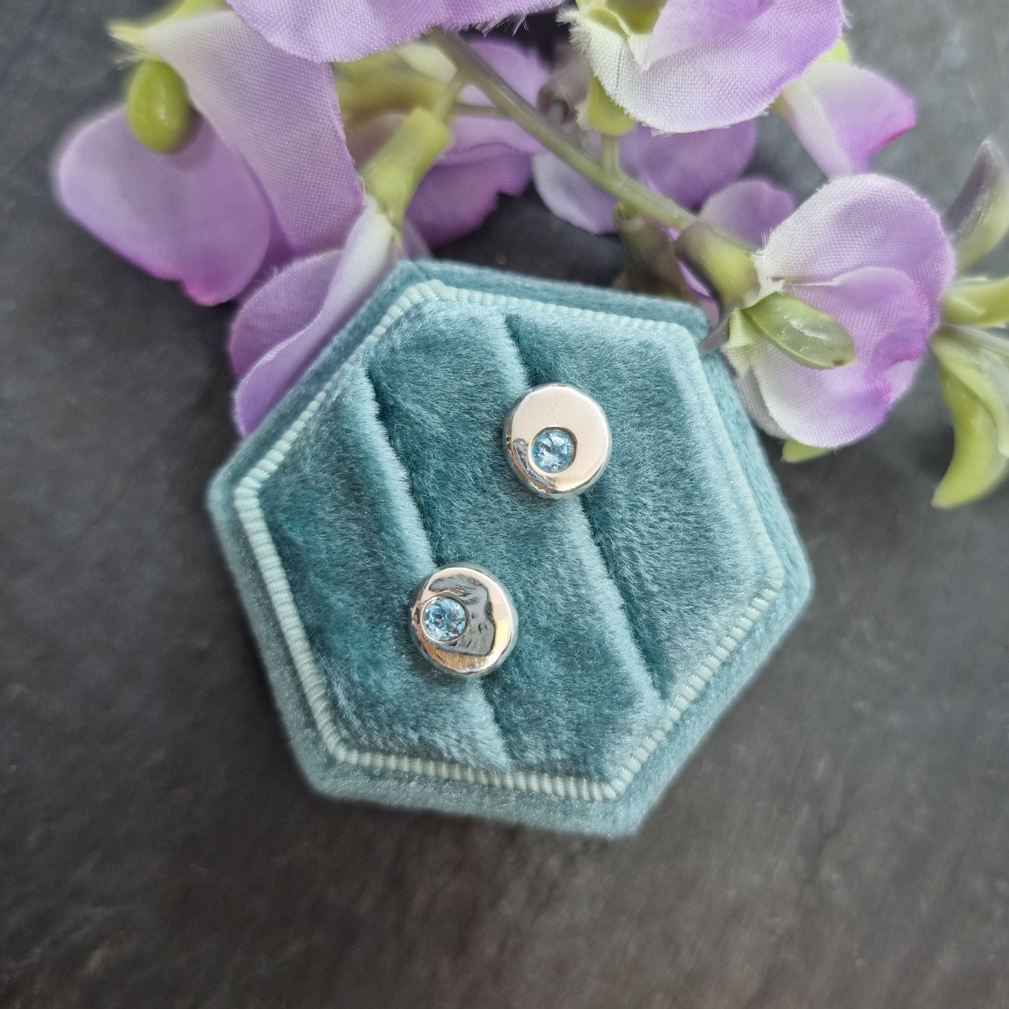 Indulge in elegance with these sterling silver stud earrings, crafted with care from recycled silver. Adorned with mesmerizing blue topaz, the birthstone for December, these earrings exude timeless charm.